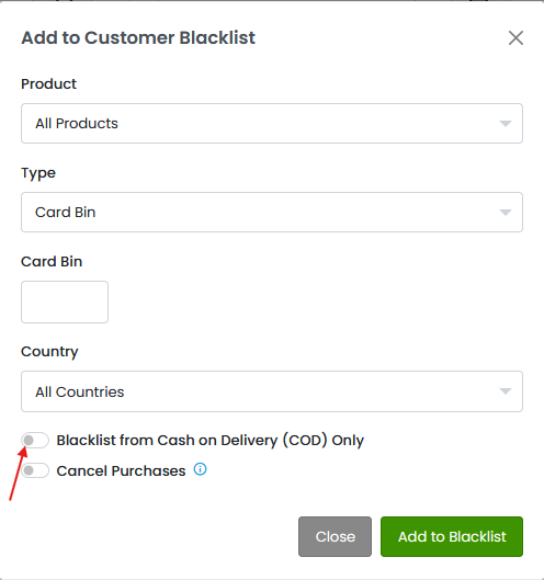 * You can also blacklist individuals from Cash On Delivery (COD) orders only by clicking the toggle **Blacklist from Cash On Delivery (COD) Only**.