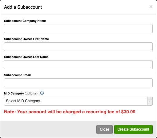 * **MID Category (optional)**- If selected, this will assign all Mids in that Mid Category to the newly created Subaccount. Creating a subaccount is the only way to transfer existing Mids from the main account.