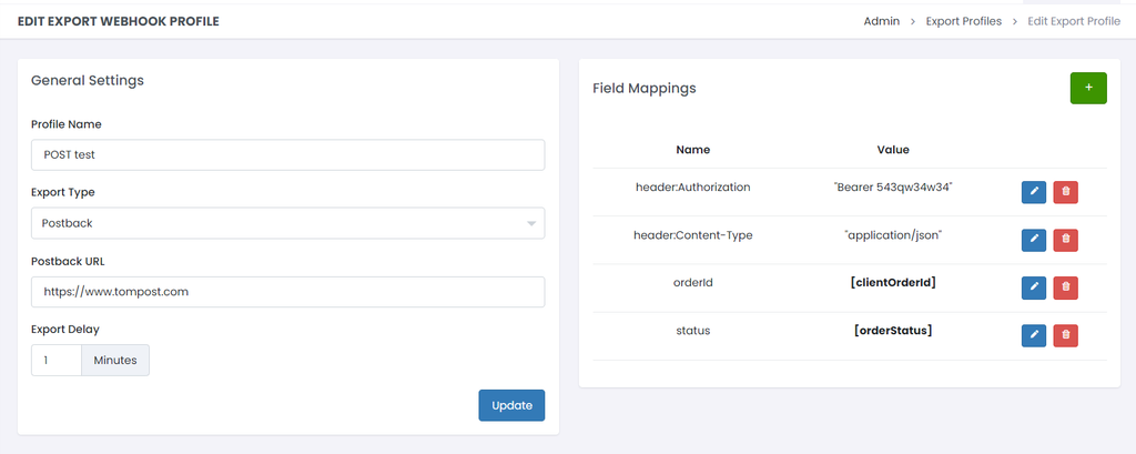 Export Profiles are used to send data to a Postback URL or FTP or CSV. This article walks you through the configuration for an **Export Webhook** sending data to a **Postback URL**.