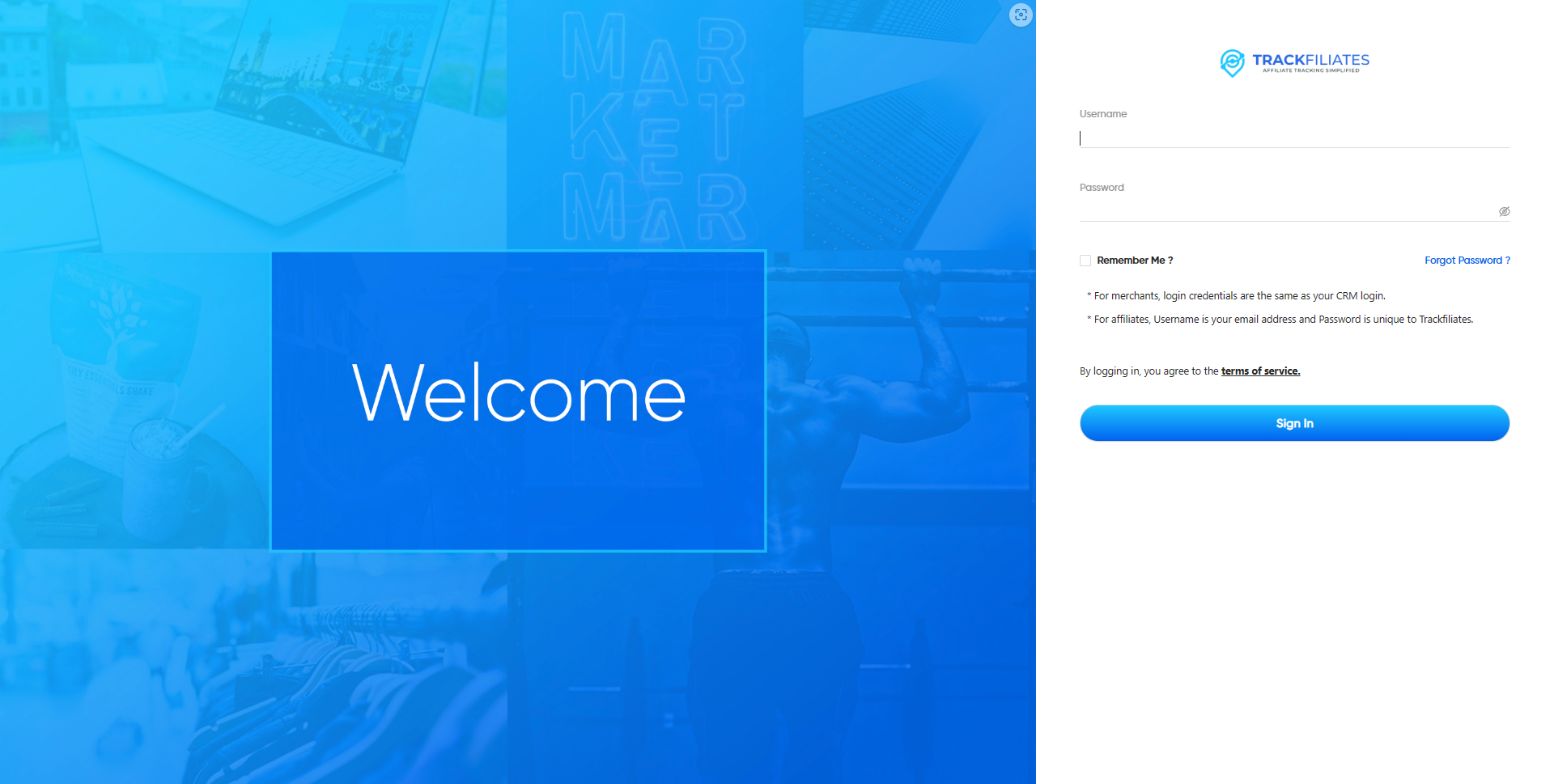 Log in to <http://app.trackfiliates.com> with your CRM login credentials.