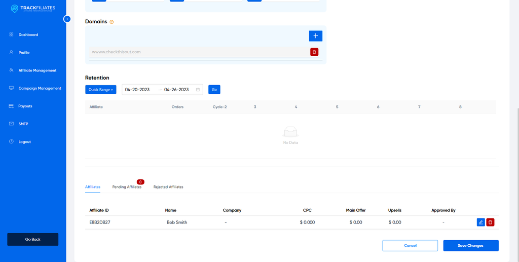 Inside the affiliate’s profile you can add them to your campaign(s), update their commission rate(s), and view their tracking string(s). You will also see a Retention chart which searches for purchases created within the date range and shows the cycle-by-cycle statistics.