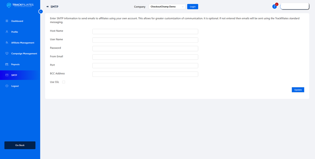 Enter SMTP information to send emails to affiliates using your own account. This allows for greater customization of communication. This is optional. If not entered then emails will be sent using the TrackFiliates standard messaging.