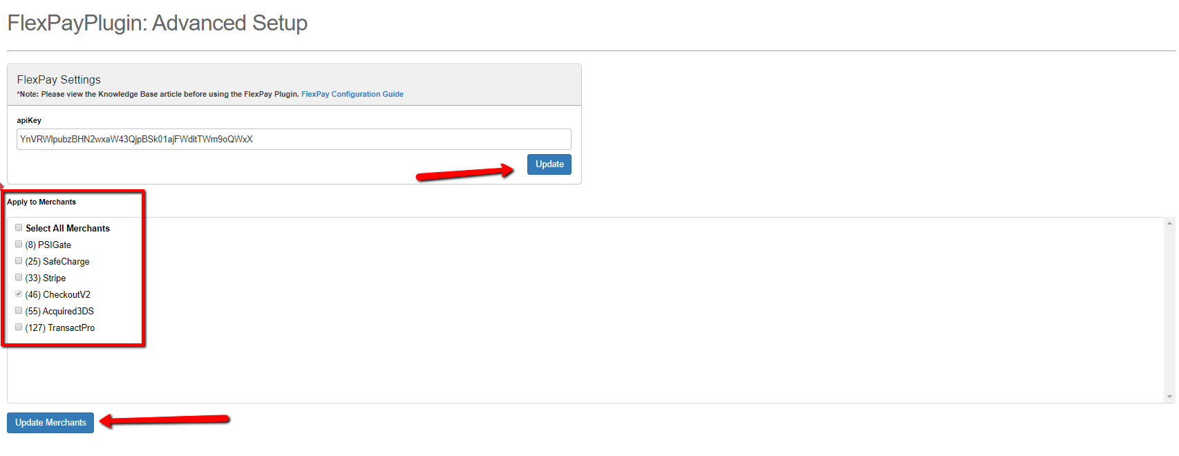 Select the gateways that should be created over at FlexPay. Once the desired gateways are selected, click the “*Update Merchants”* butto&#x6E;*.*