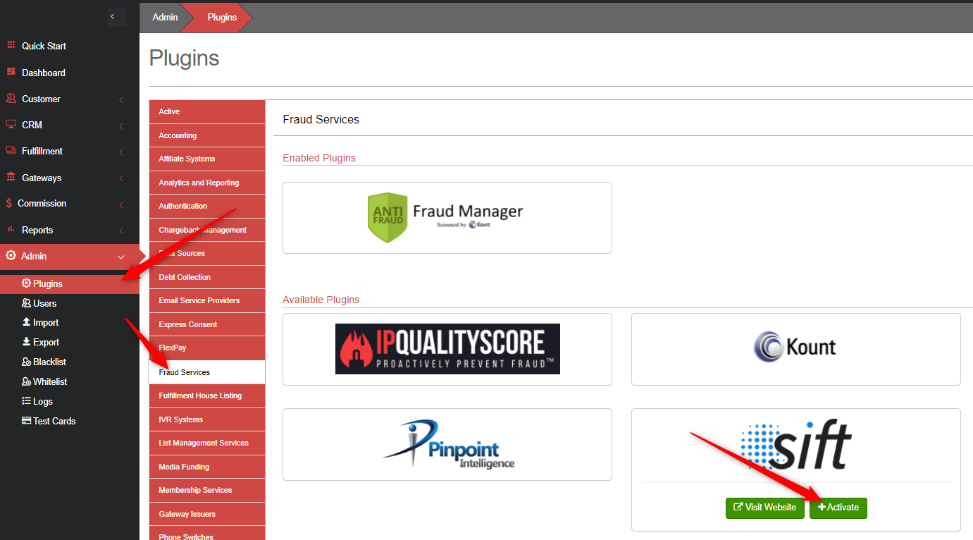 The Sift plugin can be found by navigating to **Admin → Plugins → Fraud Services**.