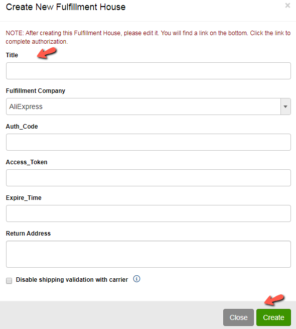 Click the green **Create** button to save and create the Fulfillment House
