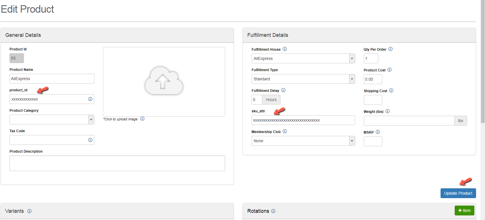 Enter **sku\_attr** and **product\_id** from AliExpress, fill other fields as needed then click the blue **Update Product** button