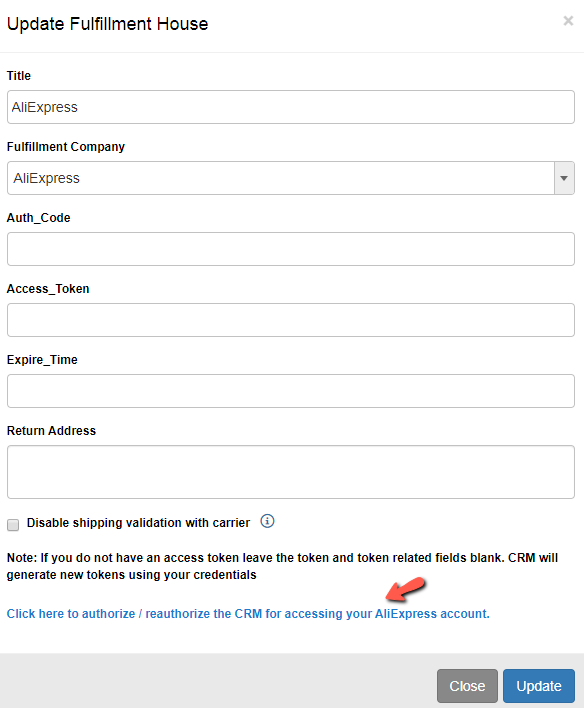 Go to Konnektive **Admin** > **Plugins** > **Fulfillment House Listing**, Scroll down to **AliExpress** and click