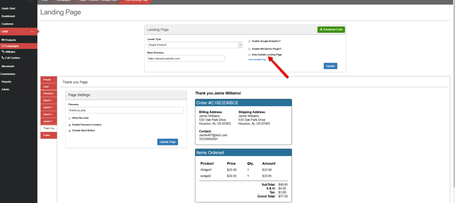 Once this is done, your landing page is fully installed and will be ready to take sales. However, it is static at this point and will not respond to changes in the CRM campaign and landing page configuration files. In order to make your page reflect pricing changes, new product images, and new product descriptions, you will need to enable the auto-update feature.