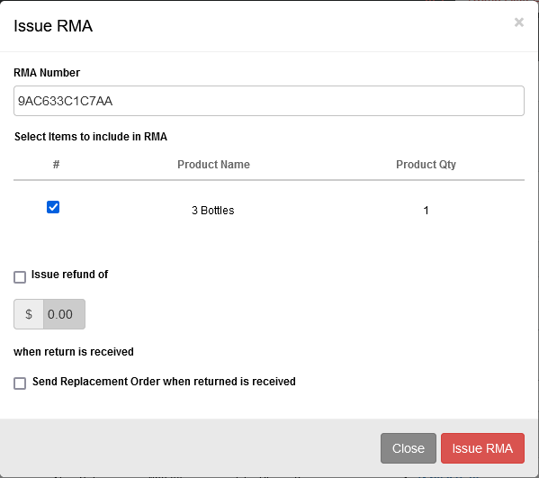 Choose items to include in the RMA. Also select if a refund should be issued upon return and if a replacement should be sent out.