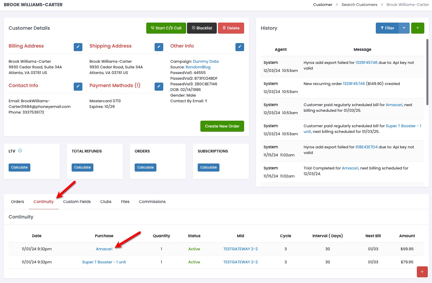 Open the **Continuity** tab to see each of the Customer's recurring purchases and then click on the hyperlinked product name for subscription purchase you need to cancel or pause.