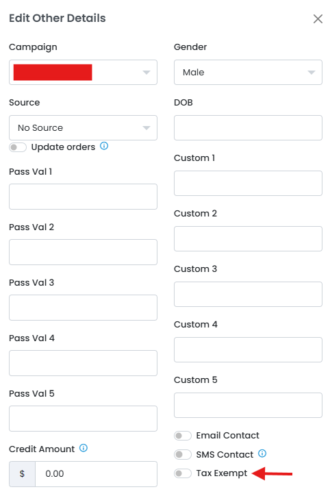 When you want to mark a customer as exempt from all sales tax, you can mark this under the "Other Info" section as shown below: