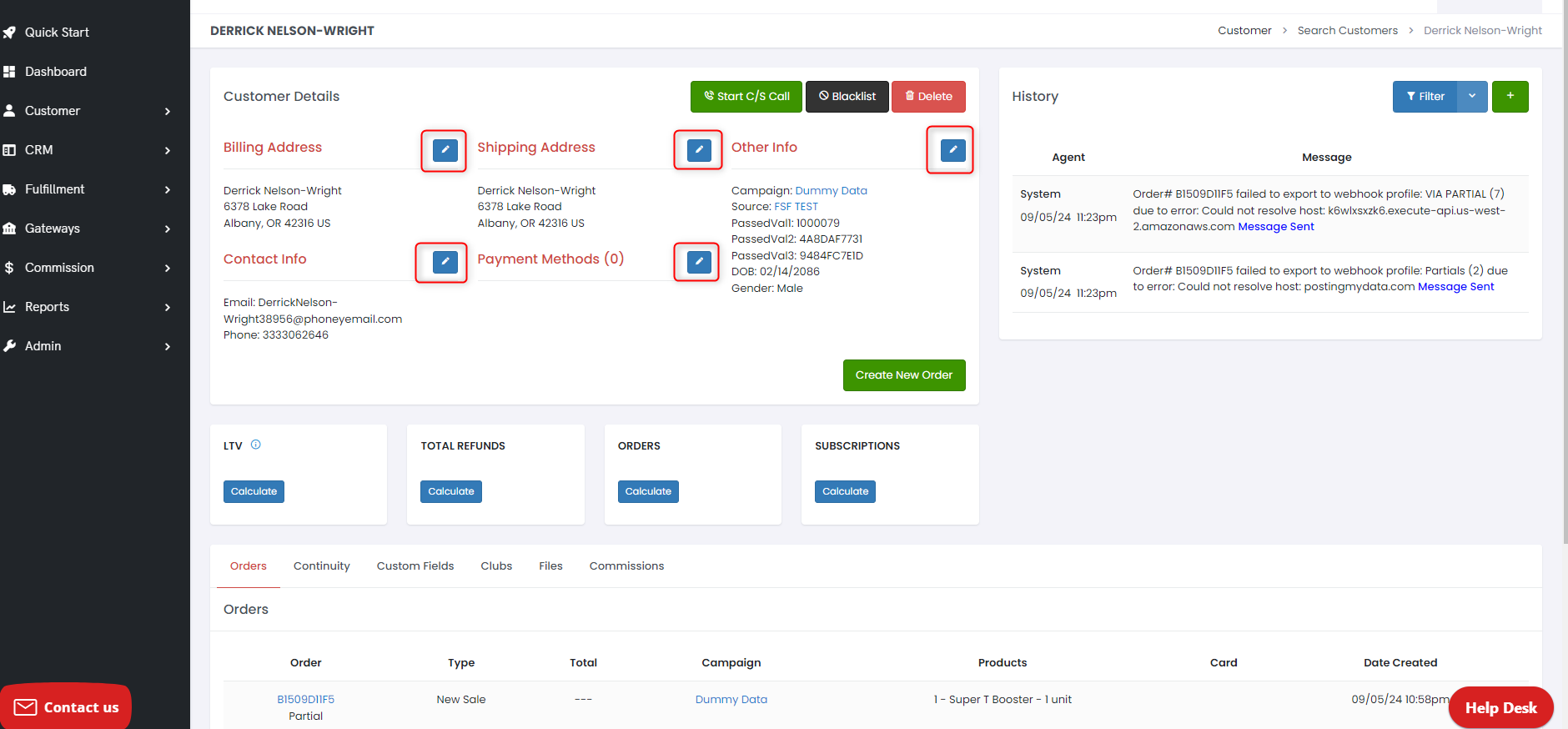 *Select* the *green* **Create New Order button** to start a new order with that customer’s information or *click* the **Start C/S Call button** to call the phone number on record with a Phone Switch Plugin