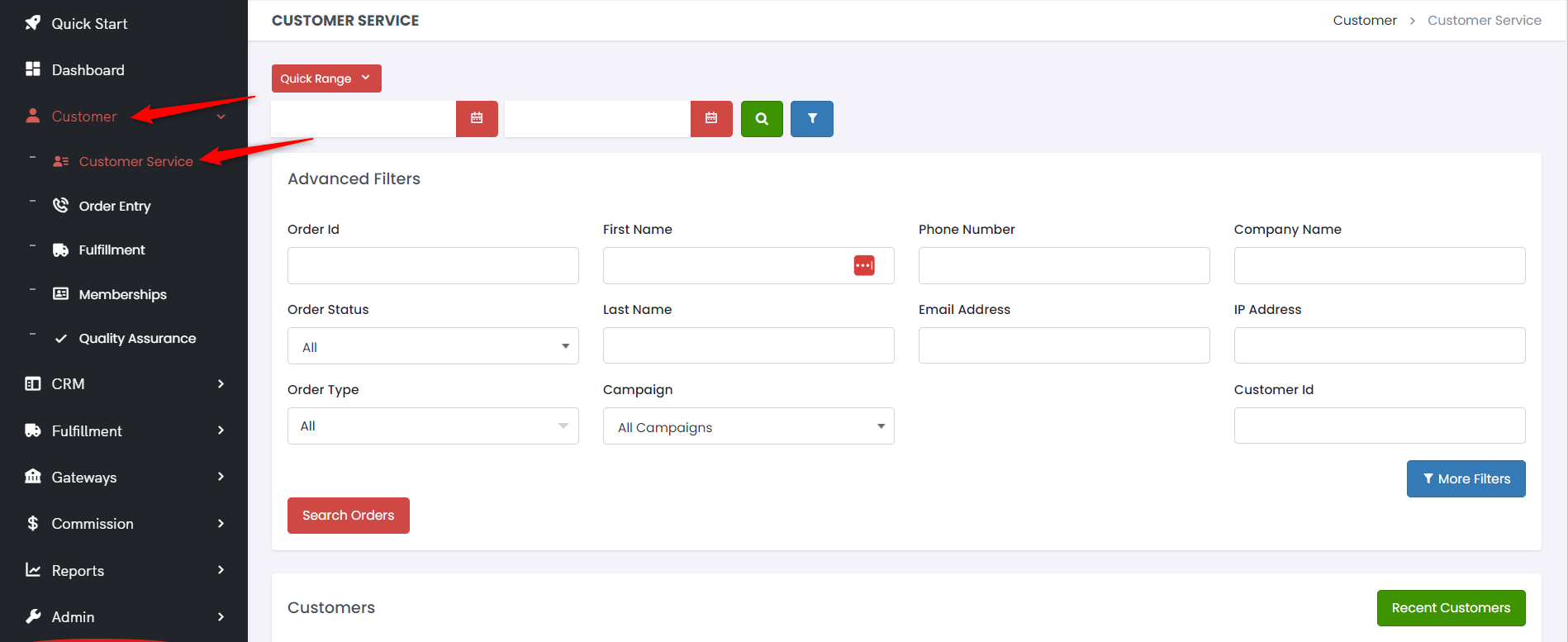 Locating a customer record is easy using the CRM's Customer Search Page. First, click on the Customer tab on the left of your screen, then Customer Service.