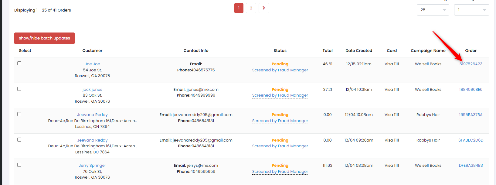 After clicking the orderId on the right side of the table, you will be presented with this screen to either approve or deny.