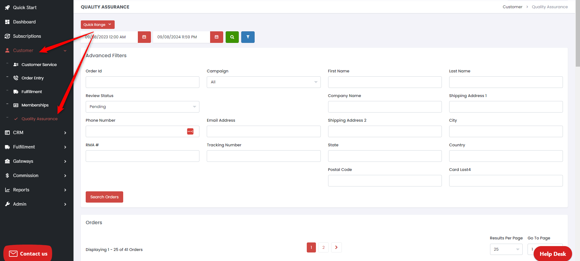 To approve or deny orders in QA Pending status, navigate to Customer → Quality Assurance and use the filters to pull those orders.