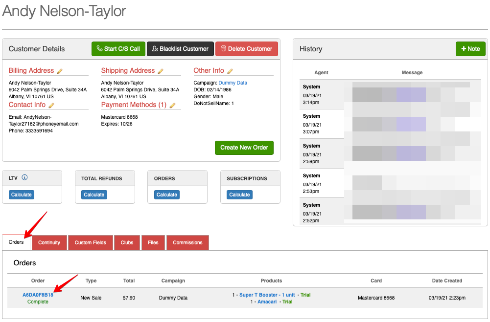 On the customer’s profile, scroll down to the **Transactions** tab then click on the red **Actions** button, then click **Void** or **Refund**.
