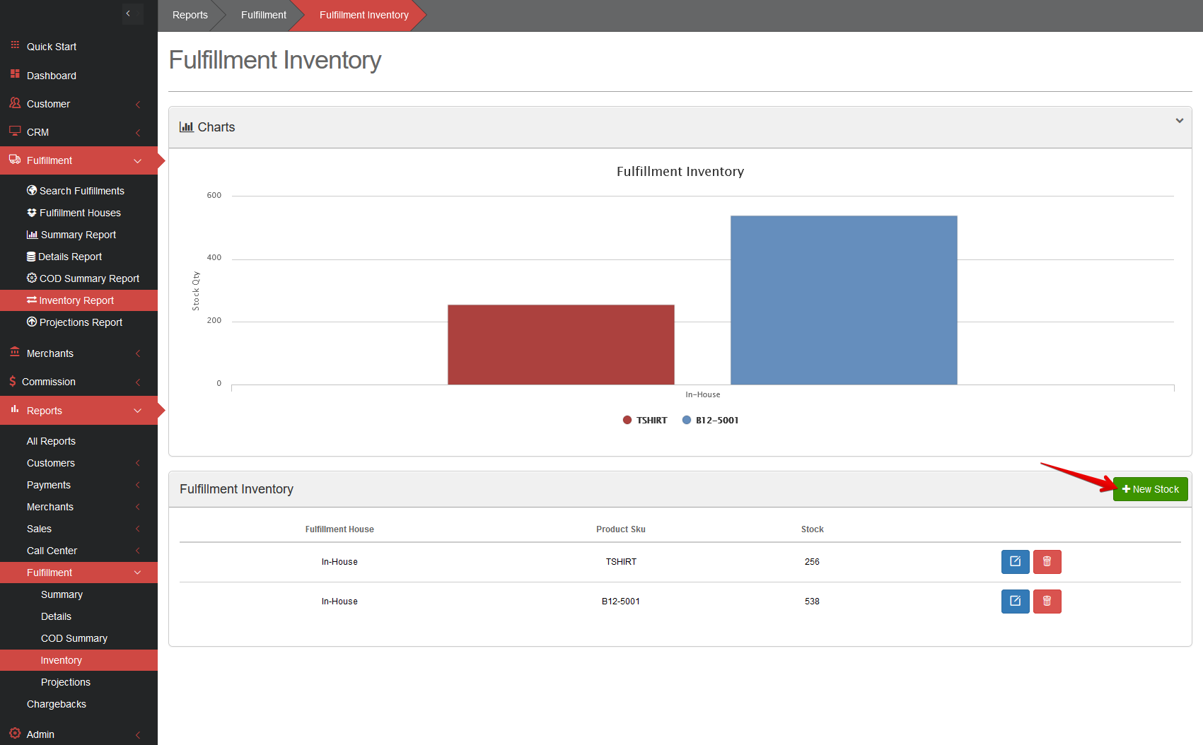 To add a new stock into your into your inventory charts click the green + New Stock button:
