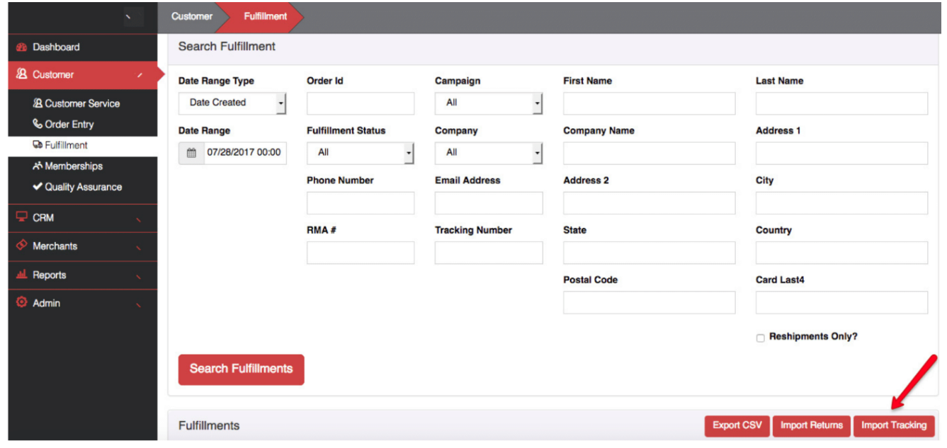 You can upload your tracking numbers within the Customer → Fulfillment page by using the Import Tracking button: