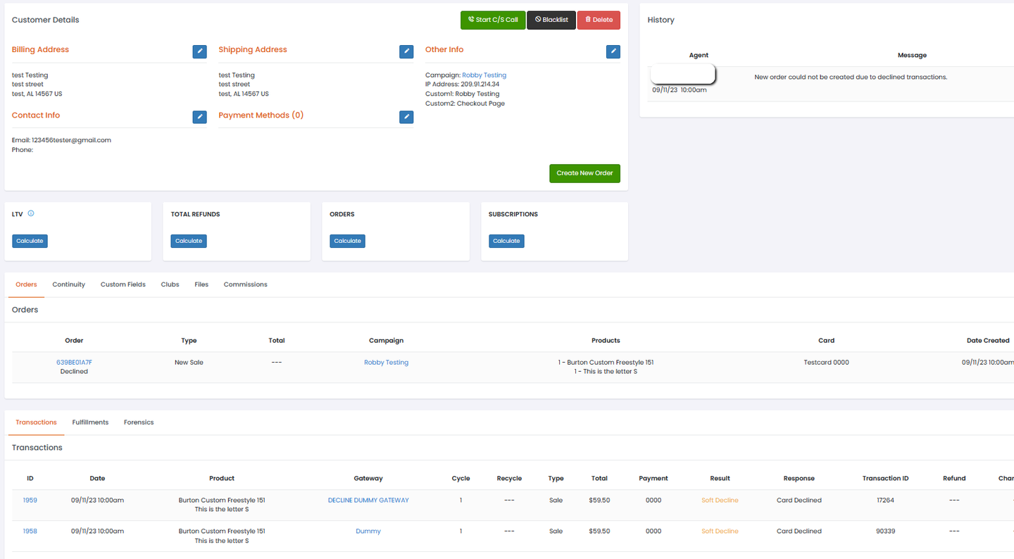 When a cascade occurs, the transaction tables will display multiple transactions from one import order call, and only a single history note on the customer profile will be recorded saying "New order could not be created due to declined transactions."