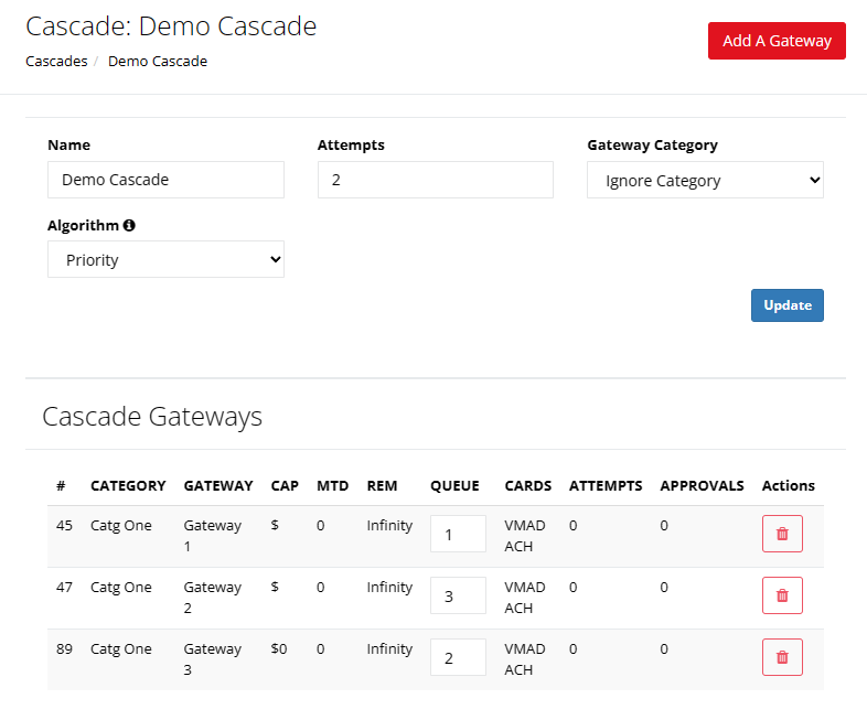 **Attempts:** The amount of times the cascade will reattempt a soft declined transaction. You cannot attempt against the same gateway multiple times. The maximum attempts allowed is 5.