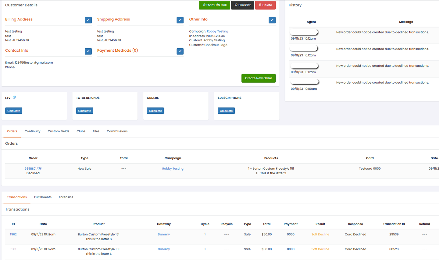 If you see the "New order could not be created due to declined transactions." message multiple times on the customer history, this means the customer clicked the submit button multiple times.