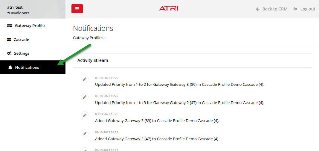 The notifications page logs system and user actions that have occurred within ATRI.