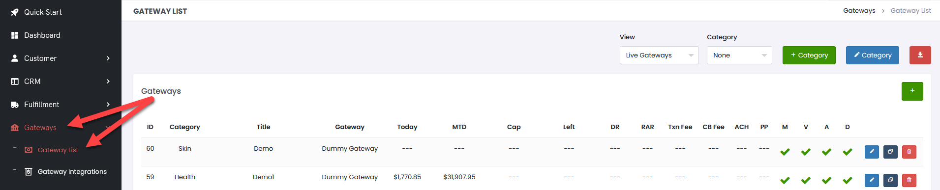 The **Gateway List** screen displays information about all of the gateways you have setup in the CRM.