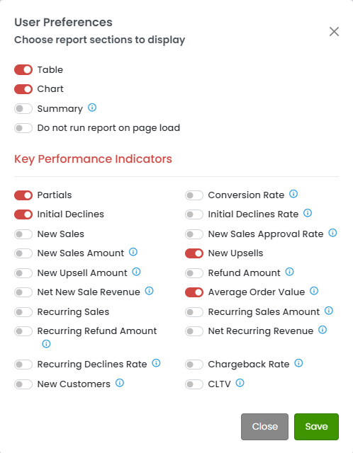 Some reports will only provide a Summary chart, while others will contain additional KPIs that can be enabled.