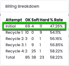 The Billing Breakdown, which pops up when you hover over the **Approval %** value, shows the results of billing for that cycle. The billing breakdown describes where a purchase landed/ended up for that cycle, and the breakdown will only display recycle numbers that purchases *ended* at.