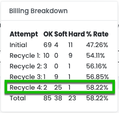 ((69 initial successes + 10 recycle1 successes + 3 recycle2 successes + 1 recycle3 success + 2 recycle4 successes) / 146 total purchases attempted to rebill for this cycle) X 100 = 58.22% approval rate after 4th recycle billing attempt