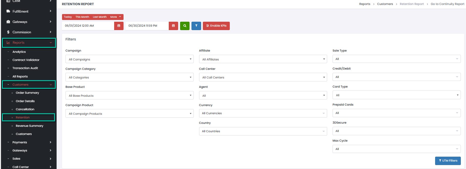 The Retention Report is found under **Reports →** **Customers → Retention**
