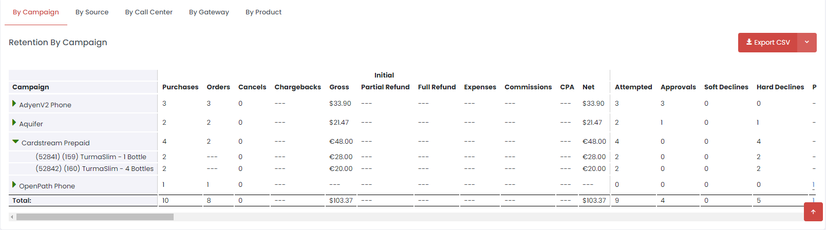 **By Campaign:** See a breakdown of the data by campaign. This data can be further expanded by the products within the campaign by clicking on the green triangle next to the campaign name.