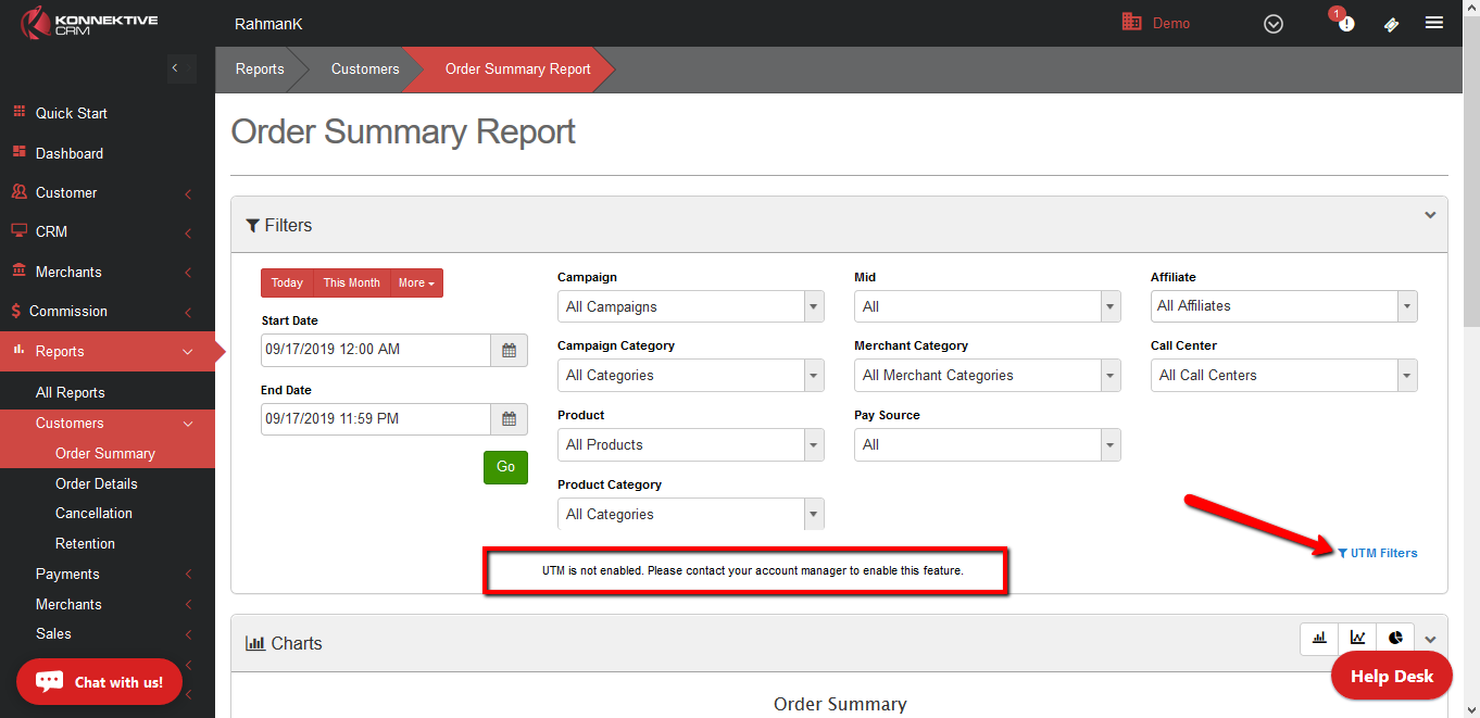 **Step 5:**  Run the Order Summary Report and filter by UTM code(s)